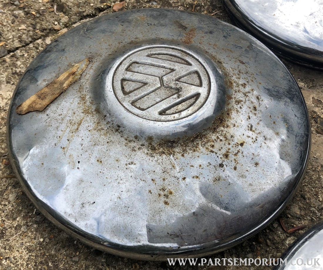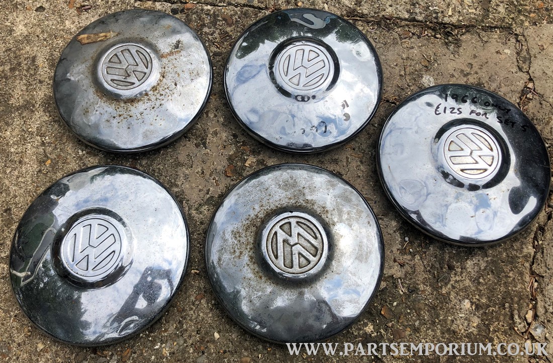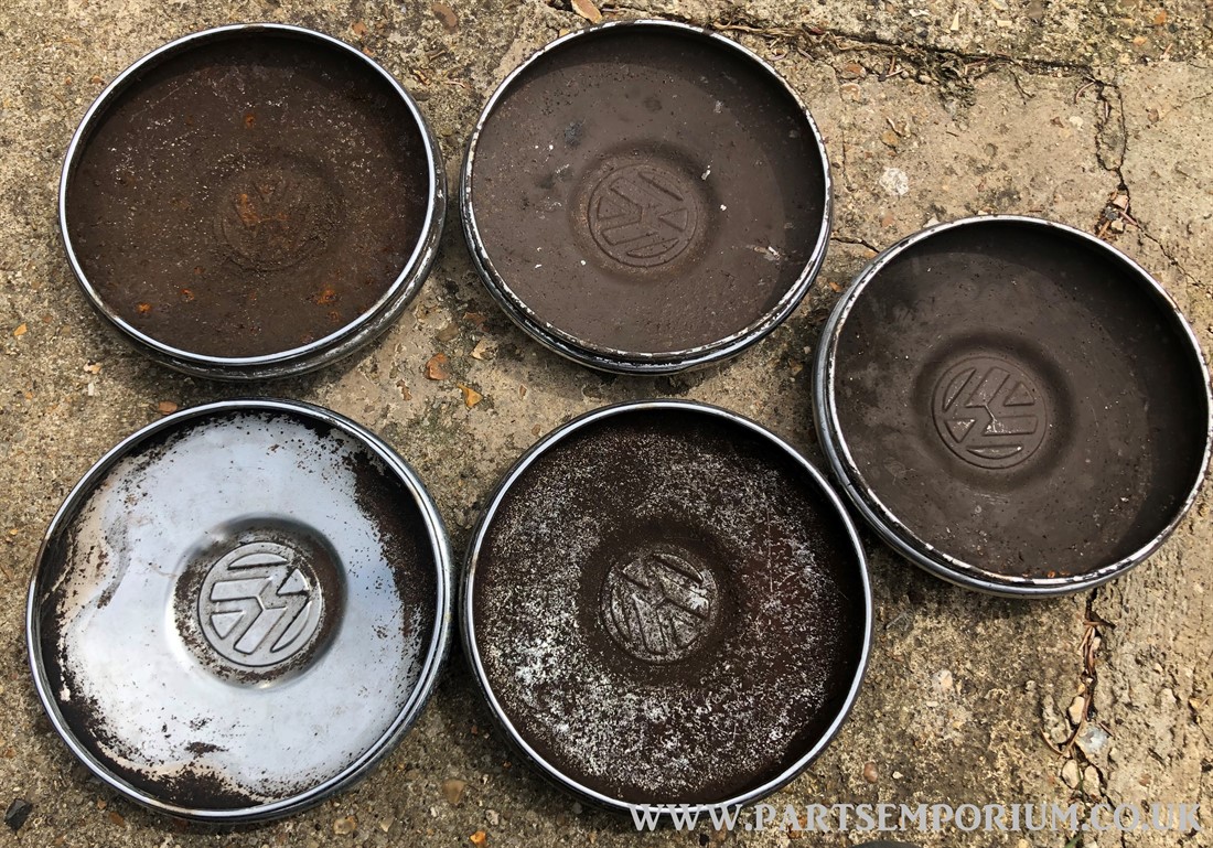 Set of 5 1966 only 5 lug Beetle Hubcaps – For semi slotted wheels – Rare – all need work