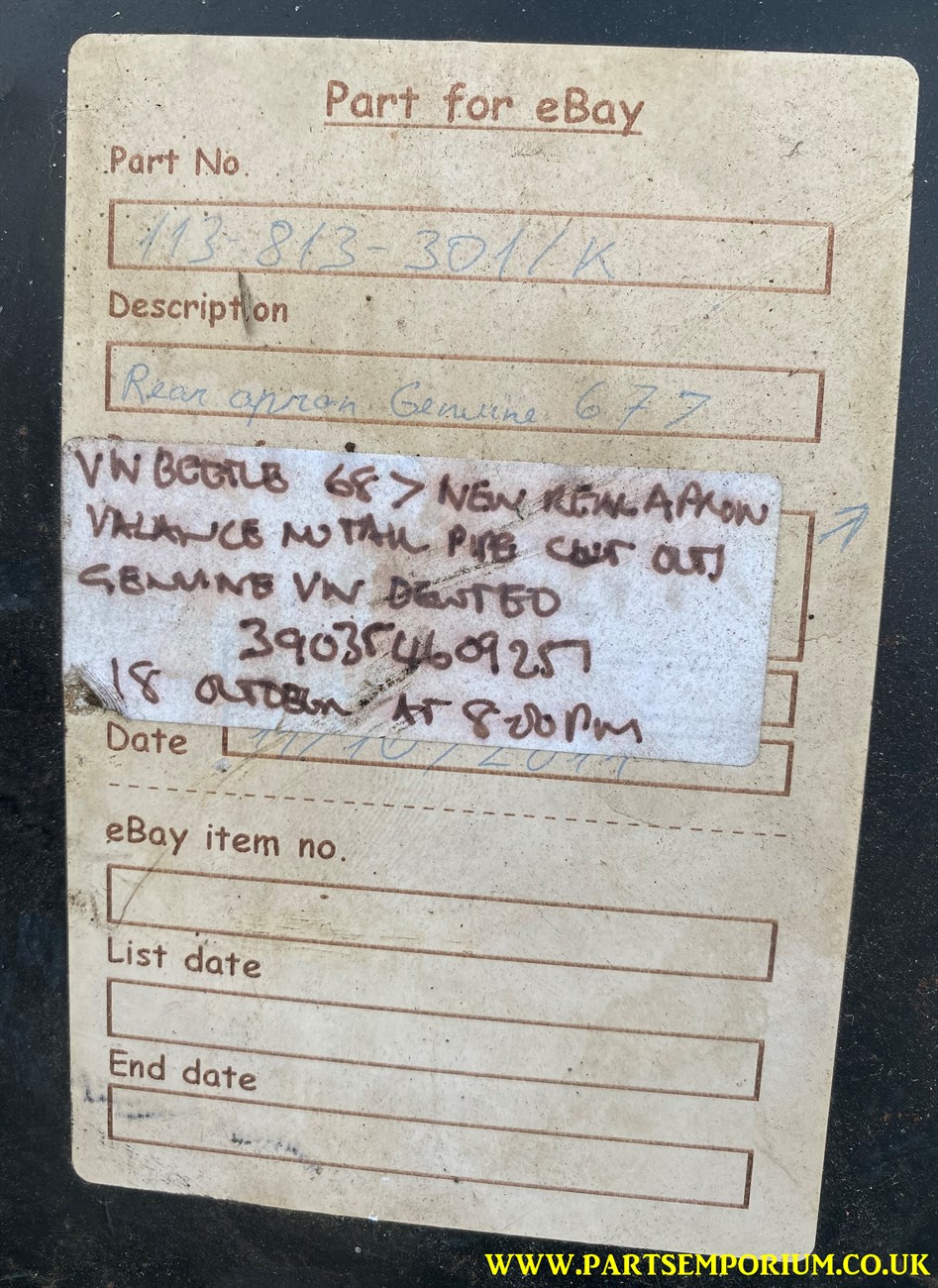 Genuine NOS Beetle rear valance – Has no tail pipe cut outs – fingers have been cut off – maybe to make it removable? £99